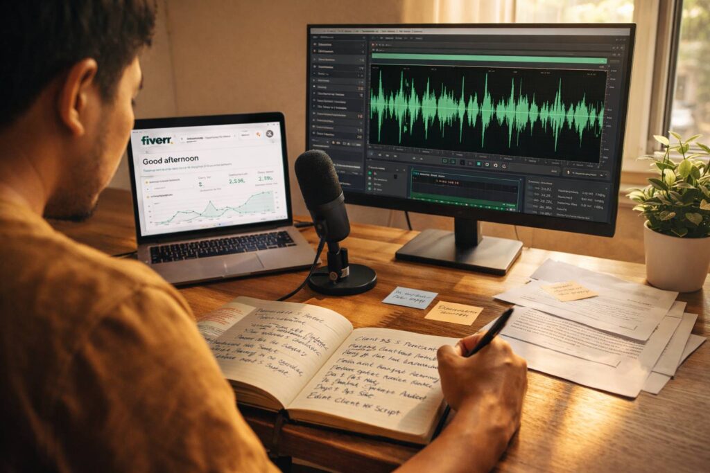 Fiverr itu kayak pasar murah buat voice over. Lo bisa pasang harga $5 untuk 100 kata—iya, lima dolar. Fee platform? 20% langsung dipotong. Jadi gue pernah dapet job $5, cuma bersih $4. Tapi ini tempat paling cepat buat ngumpulin review.